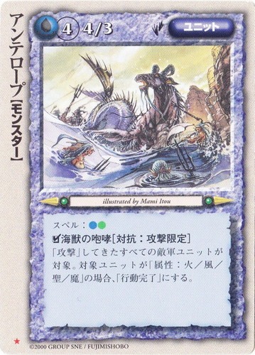 ![]() ![]() | アンテロープ ユニット 太陽王の覚醒 ★ 属性:水 種族:モンスター レベル:4 攻撃力:4 防御力:3 進軍タイプ:歩行 スペル:水土 □海獣の咆哮[対抗:攻撃限定] 「攻撃」してきたすべての敵軍ユニットが対象。対象ユニットが「属性:火/風/聖/魔」の場合、「行動完了」にする。 illustrated by Mami Itou |
