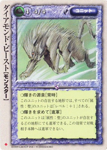 ![]() ![]() | ダイアモンド・ビースト ユニット 空中庭園の降臨 ◆ 属性:土 種族:モンスター レベル:4 攻撃力:4 防御力:4 進軍タイプ:歩行 ○輝きの源泉[常時] このユニットの存在する地形では、すべての「属性:聖」のユニットは「レベル:+1」される。 ○輝きを求めて[進軍] このユニットは「属性:聖」のユニットが存在するどの地形にでも進軍できる。この効果で対戦相手本陣へは進軍できない。 illustrated by Yasuhiro Moriki |
