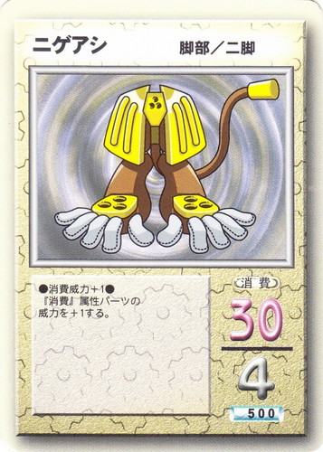 ![]() ![]() | ニゲアシ パーツ ※確認中 属性:消費 部位・タイプ:脚部/二脚 装甲値:4 機動値:30 価格:500 メダロット:モンキーゴング ●消費威力+1● 『消費』属性パーツの威力を+1する。 |