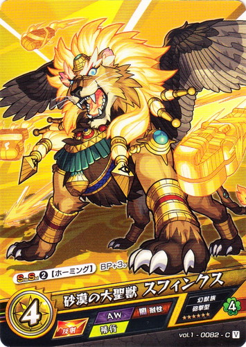 ![]() ![]() | vol.1-0082 砂漠の大聖獣 スフィンクス モンスター 第1弾 激闘ノ大和神話 C 属性:光 種族:幻獣族 戦型:砲撃型 撃種:反射 BP:4 ラック:4 ランク:V アビリティ:AW/闇耐性/飛行 【StrikeShot②】【ホーミング】BP+3。 |