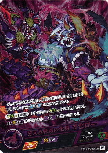 ![]() ![]() | vol.3-0022 狂える廃滅の化身 オセロー モンスター 第3弾 伝説の地に選ばれし者 SR 属性:闇 種族:魔人 戦型:パワー型 撃種:反射 BP:4 ラック:2 ランク:IV アビリティ:超AW デッキから2枚を公開し、好きな順でデッキの下に戻す。戻したカードの【貫通】1枚につきBP+3。 【友情コンボ】【爆発】トラッシュの【友情コンボ】1つを使用できる。 ※【超AW】はギミックの【AW】で増えるBP+1。 |