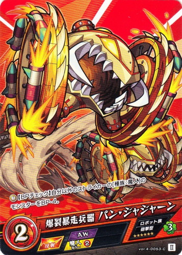 ![]() ![]() | vol.4-0053 爆裂暴走兵器 パン・ジャジャーン モンスター 第4弾 祝福されし世界 C 属性:火 種族:ロボット族 戦型:砲撃型 撃種:反射 BP:2 ラック:3 ランク:II アビリティ:AW/魔人キラー② 【タイマー】【BPチェック】自分以外のストライカーの[種族:魔人]のモンスターをBP-4。 |