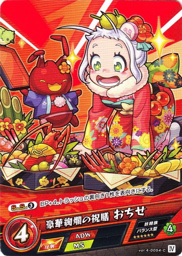 ![]() ![]() | vol.4-0054 豪華絢爛の祝膳 おちせ モンスター 第4弾 祝福されし世界 C 属性:火 種族:妖精族 戦型:バランス型 撃種:反射 BP:4 ラック:4 ランク:IV アビリティ:ADW/MS 【StrikeShot③】BP+4。トラッシュの裏向き1枚を表向きにする。 |