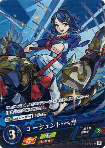 ![]() ![]() | vol.5-0030 エージェント・ベガ モンスター 第5弾 至高なる魔宴 R 属性:水 種族:亜人族 戦型:砲撃型 撃種:反射 BP:3 ラック:2 ランク:II アビリティ:MS/火耐性 このクエスト中、このモンスターは、自分以外のストライカーの[属性:火]の効果を受けない。 【友情コンボ】【レーザー】BP+2。 |