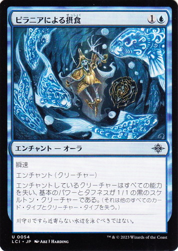![]() ![]() | LCI 0054 ピラニアによる摂食 エンチャント イクサラン:失われし洞窟 U 色:青 サブタイプ:オーラ マナコスト:(1)(青) 瞬速 エンチャント(クリーチャー) エンチャントしているクリーチャーはすべての能力を失い、基本のパワーとタフネスが1/1の黒のスケルトン・クリーチャーである。(それは他のすべてのカード・タイプとクリーチャー・タイプを失う。) 川守りですら近寄らない水辺を泳ぐべきではない。 illust:ABZ J HARDING |