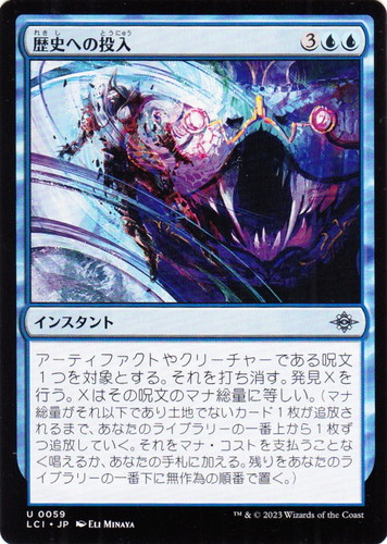 ![]() ![]() | LCI 0059 歴史への投入 インスタント イクサラン:失われし洞窟 U 色:青 マナコスト:(3)(青)(青) アーティファクトやクリーチャーである呪文1つを対象とする。それを打ち消す。発見Xを行う。Xはその呪文のマナ総量に等しい。(マナ総量がそれ以下で土地でないカード1枚が追放されるまで、あなたのライブラリーの一番上から1枚ずつ追放していく。それをマナ・コストを支払うことなく唱えるか、あなたの手札に加える。残りをあなたのライブラリーの一番下に無作為の順番で置く。) illust:ELI MINAYA |