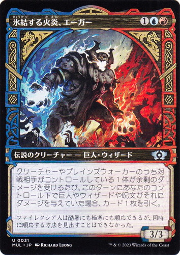 ![]() ![]() | MUL 0031 氷結する火炎、エーガー 伝説のクリーチャー 機械兵団の進軍:多元宇宙の伝説 U 色:青/赤 サブタイプ:巨人・ウィザード マナコスト:(1)(青)(赤) パワー:3 タフネス:3 クリーチャーやプレインズウォーカーのうち対戦相手がコントロールしている1体が余剰のダメージを受けるたび、このターンにあなたのコントロール下で巨人やウィザードや呪文がそれにダメージを与えていた場合、カード1枚を引く。 ファイレクシア人は酷暑にも極寒にも順応できるが、同時に順応する方法を見出すことはできなかった。 illust:RICHARD LUONG |