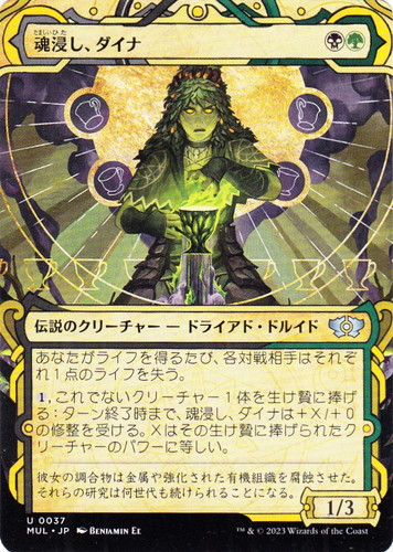 ![]() ![]() | MUL 0037 魂浸し、ダイナ 伝説のクリーチャー 機械兵団の進軍:多元宇宙の伝説 U 色:黒/緑 サブタイプ:ドライアド・ドルイド マナコスト:(黒)(緑) パワー:1 タフネス:3 あなたがライフを得るたび、各対戦相手はそれぞれ1点のライフを失う。 (1), これでないクリーチャー1体を生け贄に捧げる:ターン終了時まで、魂浸し、ダイナは+X/+0の修整を受ける。Xはその生け贄に捧げられたクリーチャーのパワーに等しい。 彼女の調合物は金属や強化された有機組織を腐蝕させた。それらの研究は何世代も続けられることになる。 illust:BENJAMIN EE |