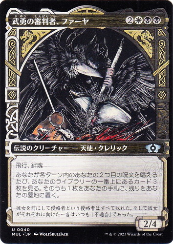 ![]() ![]() | MUL 0040 武勇の審判者、ファーヤ 伝説のクリーチャー 機械兵団の進軍:多元宇宙の伝説 U 色:白/黒 サブタイプ:天使・クレリック マナコスト:(2)(白)(黒)(黒) パワー:2 タフネス:4 飛行、絆魂 あなたが各ターン内のあなたの2つ目の呪文を唱えるたび、あなたのライブラリーの一番上にあるカード3枚を見る。そのうち1枚をあなたの手札に、残りをあなたの墓地に置く。 彼女を前にして侵略者という侵略者はすべて敗れた。そして彼女がそれぞれに向けた一言はいつも「不適当」であった。 illust:WOLFSKULLJACK |