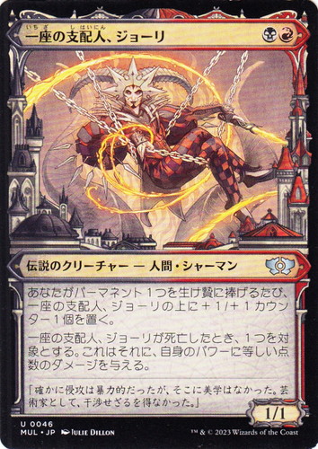 ![]() ![]() | MUL 0046 一座の支配人、ジョーリ 伝説のクリーチャー 機械兵団の進軍:多元宇宙の伝説 U 色:黒/赤 サブタイプ:人間・シャーマン マナコスト:(黒)(赤) パワー:1 タフネス:1 あなたがパーマネント1つを生け贄に捧げるたび、一座の支配人、ジョーリの上に+1/+1カウンター1個を置く。 一座の支配人、ジョーリが死亡したとき、1つを対象とする。これはそれに、自身のパワーに等しい点数のダメージを与える。 「確かに侵攻は暴力的だったが、そこに美学はなかった。芸術家として、干渉せざるを得なかった。」 illust:JULIE DILLON |