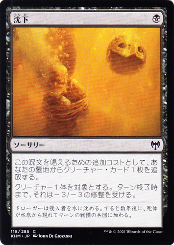 ![]() ![]() | KHM 118 沈下 ソーサリー カルドハイム C 色:黒 マナコスト:(黒) この呪文を唱えるための追加コストとして、あなたの墓地からクリーチャー・カード1枚を追放する。 クリーチャー1体を対象とする。ターン終了時まで、それは-3/-3の修整を受ける。 ドローガーは侵入者を水に沈める。すると数年後に、死体が水底から現れてマーンの戦慄の兵団に加わる。 illust:JOHN DI GIOVANNI |