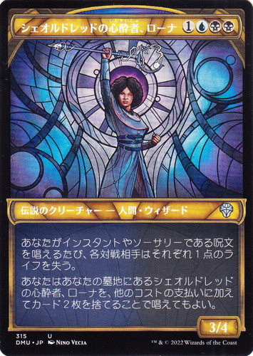 ![]() ![]() | DMU 315 シェオルドレッドの心酔者、ローナ 伝説のクリーチャー 団結のドミナリア U 色:青/黒 サブタイプ:人間・ウィザード マナコスト:(1)(青)(黒)(黒) パワー:3 タフネス:4 あなたがインスタントやソーサリーである呪文を唱えるたび、各対戦相手はそれぞれ1点のライフを失う。 あなたはあなたの墓地にあるシェオルドレッドの心酔者、ローナを、他のコストの支払いに加えてカード2枚を捨てることで唱えてもよい。 illust:NINO VECIA |