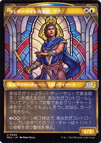 ![]() ![]() | MUL 0056 ウェザーライトの重鎮、ラフ 伝説のクリーチャー 機械兵団の進軍:多元宇宙の伝説 U 色:白/青 サブタイプ:人間・ウィザード マナコスト:(白)(青) パワー:1 タフネス:3 あなたがインスタントやソーサリーである呪文1つを唱えるたび、あなたがコントロールしていてアンタップ状態であるクリーチャー2体をタップしてもよい。そうしたなら、カード1枚を引く。 (3)(白)(白):ターン終了時まで、あなたがコントロールしているすべてのクリーチャーは+1/+1の修整を受け警戒を得る。 illust:NINO VECIA |