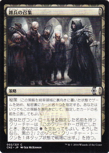 ![]() ![]() | CN2 002 雑兵の召集 策略 コンスピラシー:王位争奪 C 色:黒 透かしシンボル:封蝋 秘策(この策略を統率領域に裏向きで置いた状態でゲームを始め、秘密裏にカード名1つを指定する。あなたはいつでもこの策略を表向きにして、指定したカードの名前を公開してもよい。) あなたがコントロールする指定した名前を持つクリーチャーは「このクリーチャーが死亡したとき、あなたは(黒)を支払ってもよい。そうしたなら、黒の2/2のゾンビ・クリーチャー・トークンを1体タップ状態で戦場に出す。」を持つ。 illust:SEB MCKINNON |