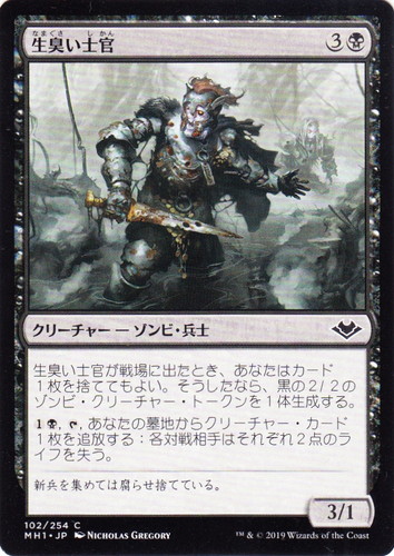 ![]() ![]() | MH1 102 生臭い士官 クリーチャー モダンホライゾン C 色:黒 サブタイプ:ゾンビ・兵士 マナコスト:(3)(黒) パワー:3 タフネス:1 生臭い士官が戦場に出たとき、あなたはカード1枚を捨ててもよい。そうしたなら、黒の2/2のゾンビ・クリーチャー・トークンを1体生成する。 (1)(黒), [T], あなたの墓地からクリーチャー・カード1枚を追放する:各対戦相手はそれぞれ2点のライフを失う。 新兵を集めては腐らせ捨てている。 illust:NICHOLAS GREGORY |
