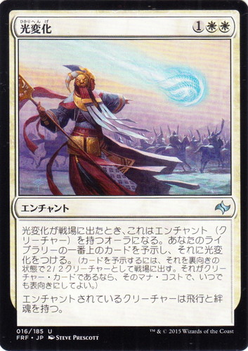 ![]() ![]() | FRF 016 光変化 エンチャント 運命再編 U 色:白 マナコスト:(1)(白)(白) 光変化が戦場に出たとき、これはエンチャント(クリーチャー)をもつオーラになる。あなたのライブラリーの一番上のカードを予示し、それに光変化をつける。(このカードを予示するには、それを裏向きの状態で2/2のクリーチャーとして戦場に出す。それがクリーチャー・カードであるなら、そのマナ・コストで、いつでも表向きにしてよい。) エンチャントされているクリーチャーは飛行と絆魂を持つ。 illust:STEVE PRESCOTT |