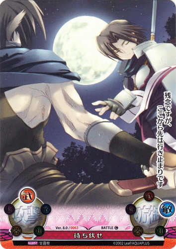 ![]() ![]() | Ver.8.0/0063 待ち伏せ バトル バージョン8.0 C 攻撃:武/防:敏 残念ですが、ここっから先は行き止まりです illust:甘露樹 |