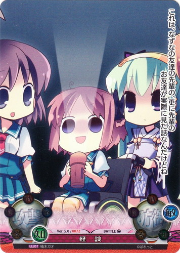 ![]() ![]() | Ver.5.0/0072 怪談 バトル バージョン5.0 C 攻撃:知/防御:敏 これは、なずなの友達の先輩の、更に先輩のお友達が実際に見た話なんだけどね―― illust:柚木ガオ |