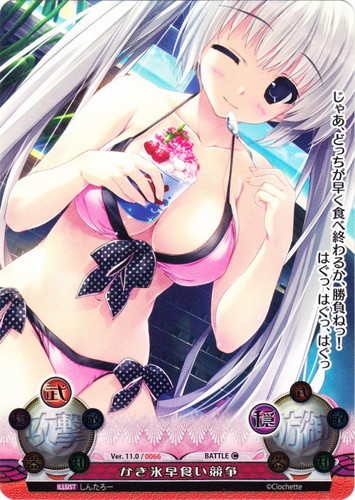 ![]() ![]() | Ver.11.0/0066 かき氷早食い競争 バトル バージョン11.0 C 攻撃:武/防御:穏 じゃあ、どっちが早く食べ終わるか、勝負ねっ!はぐっ、はぐっ、はぐっ illust:しんたろー |