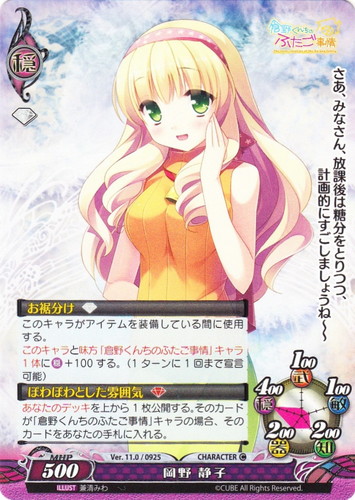 ![]() ![]() | Ver.11.0/0925 岡野 静子 キャラクター バージョン11.0 C 属性:穏 コスト:[白] 気力:500 武:100 敏:100 知:200 器:200 穏:400 【お裾分け[白]】このキャラがアイテムを装備している間に使用する。このキャラと味方「倉野くんちのふたご事情」キャラ1体に穏+100する。(1ターンに1回まで宣言可能) 【ぽわぽわとした雰囲気[赤]】あなたのデッキを上から1枚公開する。そのカードが「倉野くんちのふたご事情」キャラの場合、そのカードをあなたの手札に入れる。 さあ、みなさん、放課後は糖分をとりつつ、計画的にすごしましょうね~~ illust:兼清みわ 作品名::倉野くんちのふたご事情 |