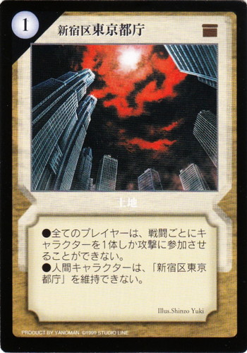 ![]() ![]() | L01 新宿区東京都庁 土地 構築済みスターター type X・Y プレイコスト:1 ●全てのプレイヤーは、戦闘ごとにキャラクターを1体しか攻撃に参加させることができない。 ●人間キャラクターは、「新宿区東京都庁」を維持できない。 illust:Shinzo Yuki |