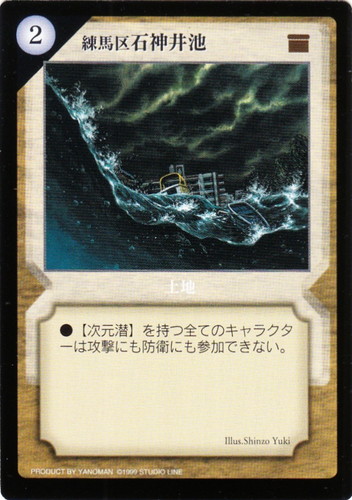 ![]() ![]() | L04 練馬区石神井池 土地 構築済みスターター type X・Y プレイコスト:2 ●【次元潜】を持つ全てのキャラクターは攻撃にも防衛にも参加できない。 illust:Shinzo Yuki |