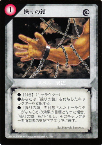 ![]() ![]() | S01 操りの鎖 スペル 構築済みスターター type X・Y タイプ:異法 プレイコスト:1 ●【付与】(キャラクター) ●あなたは「操りの鎖」を付与したキャラクターを支配する。 ●「操りの鎖」を付与されたキャラクターがなんらかの効果の目標となった場合、「操りの鎖」をパイルし、そのキャラクターを所有者の支配下でエリアに戻す。 illust:Hiroyuki Betsuyaku |