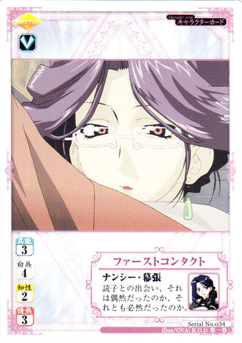 ![]() ![]() | Serial No.034 ファーストコンタクト キャラクター R.O.D Paper Card Battle 色:黄 異能:3 白兵:4 知性:2 情熱:3 タイプ:V アイコン:ナンシー・幕張 ナンシー・幕張 読子との出会い、それは偶然だったのか、それとも必然だったのか。 illust:OVA「R.O.D 第一巻」 |