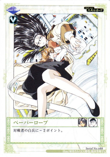 ![]() ![]() | Serial No.088 ペーパーロープ スキル R.O.D Paper Card Battle 色:青 タイプ:V アイコン:読子・リードマン/ドニー・ナカジマ 対戦者の白兵に-2ポイント。 illust:羽音たらく(CG彩色:島田美和子 |