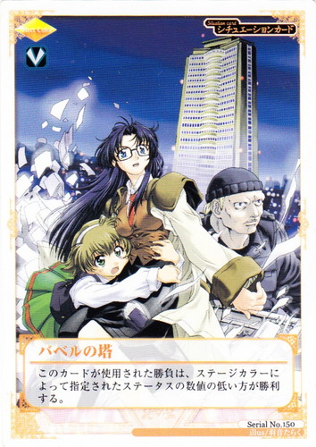![]() ![]() | Serial No.150 バベルの塔 シチュエーション R.O.D Paper Card Battle 色:黄 タイプ:V このカードが使用された勝負は、ステージカラーによって指定されたステータスの数値の低い方が勝利する。 illust:羽音たらく |