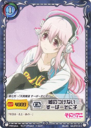 ![]() ![]() | SA-ST012 嘘のつけない すーぱーそに子 キャラクター スターターデッキ そにアニ C 色:青 コスト:1 BP:4000 (進化先→「天真爛漫 すーぱーそに子」) 「今日は・・・えと・・・あの・・・」 作品名:そにアニ |