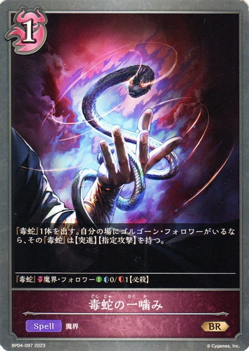 ![]() ![]() | BP04-097 毒蛇の一噛み スペル ブースターパック 第4弾 天星神話 BR クラス:ナイトメア タイプ:魔界 コスト:1 『毒蛇』1枚を出す。自分の場にゴルゴーン・フォロワーがいるなら、その『毒蛇』は【突進】【指定攻撃】を持つ。 『毒蛇』ナイトメア・魔界・フォロワー①攻撃力0/体力1【必殺】 |
