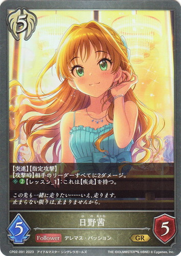 ![]() ![]() | CP02-091 日野茜 フォロワー コラボパック アイドルマスター シンデレラガールズ GR クラス:ビショップ タイプ:デレマス・パッション コスト:5 攻撃力:5 体力:5 【突進】【指定攻撃】 【攻撃時】相手のリーダーすべてに2ダメージ。 ◇②【レッスン_1】:これは【疾走】を持つ。 この先も一緒に走りたい・・・・・・いえ、走ります。 止まらない限りは、止まりませんから。 作品名:アイドルマスター シンデレラガールズ |