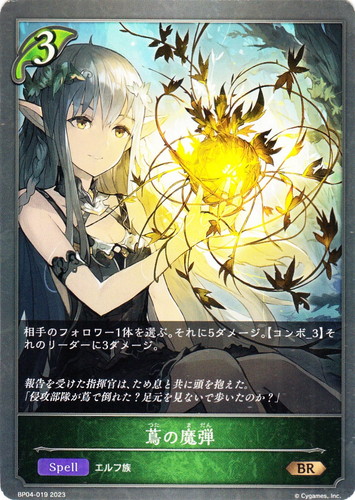 ![]() ![]() | BP04-019 蔦の魔弾 スペル ブースターパック 第4弾 天星神話 BR クラス:エルフ タイプ:エルフ族 コスト:3 相手のフォロワー1体を選ぶ。それに5ダメージ。【コンボ_3】それのリーダーに3ダメージ。 報告を受けた指揮官は、ため息と共に頭を抱えた。 「侵攻部隊が蔦で倒れた?足元を見ないで歩いたのか?」 |
