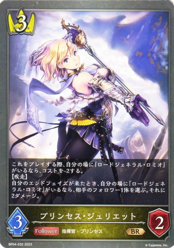 ![]() ![]() | BP04-032 プリンセス・ジュリエット フォロワー ブースターパック 第4弾 天星神話 BR クラス:ロイヤル タイプ:指揮官・プリンセス コスト:3 攻撃力:3 体力:2 これをプレイする際、自分の場に『ロードジェネラル・ロミオ』がいるなら、コストを-2する。 【疾走】 自分のエンドフェイズが来たとき、自分の場に『ロードジェネラル・ロミオ』がいるなら、相手のフォロワー1体を選ぶ。それに2ダメージ。 |