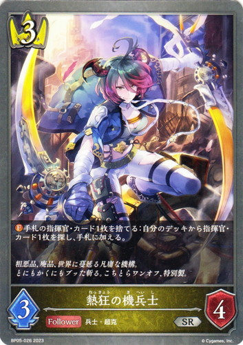 ![]() ![]() | BP05-026 熱狂の機兵士 フォロワー ブースターパック 第5弾 永劫なる絶傑 SR クラス:ロイヤル タイプ:兵士・超克 コスト:3 攻撃力:3 体力:4 【F】手札の指揮官・カード1枚を捨てる:自分のデッキから指揮官・カード1枚を探し、手札に加える。 粗悪品、廃品、世界に蔓延る凡庸な機構。 とにもかくにもブッた斬る。こちとらワンオフ、特別製。 |