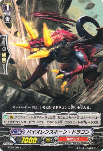 ![]() ![]() | BT15/061 バイオレンスホーン・ドラゴン ノーマルユニット ブースターパック 第15弾 無限転生 C 国家:ドラゴンエンパイア クラン:かげろう 種族:フレイムドラゴン スキル:ブースト グレード:1 パワー:7000 クリティカル:1 シールド値:5000 【自】【R】:このユニットがアタックした時、あなたのカード名に「オーバーロード」を含むヴァンガードがいるなら、そのバトル中、このユニットのパワー+3000。 オーバーロードは、いるだけでドラゴンに誇りを与える。 イラスト:安達洋介 |