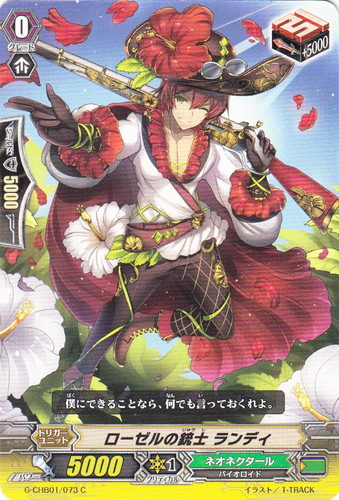 ![]() ![]() | G-CHB01/073 ローゼルの銃士 ランディ トリガーユニット Gキャラクターブースター 01 トライスリーNEXT C 国家:ズー クラン:ネオネクタール 種族:バイオロイド スキル:ブースト グレード:0 パワー:5000 クリティカル:1 シールド値:5000 トリガー:引 トリガー修正:+5000 僕にできることなら、何でも言っておくれよ。 イラスト:T-TRACK |