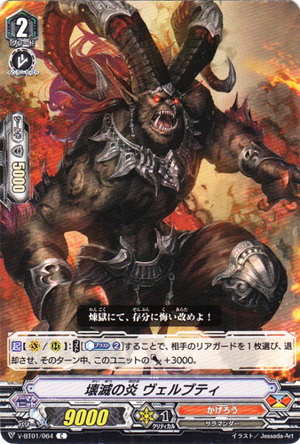 ![]() ![]() | V-BT01/064 壊滅の炎 ヴェルブティ ノーマルユニット Vブースターパック 第1弾 結成!チームQ4 C 国家:ドラゴンエンパイア クラン:かげろう 種族:サラマンダー スキル:インターセプト グレード:2 パワー:9000 クリティカル:1 シールド値:5000 【起】【V/R】:【コスト[【カウンターブラスト②】]】することで、相手のリアガードを1枚選び、退却させ、そのターン中、このユニットのパワー+3000。 煉獄にて、存分に悔い改めよ! イラスト:Jossada-Art |