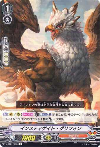 ![]() ![]() | V-BT01/066 インスティゲイト・グリフォン ノーマルユニット Vブースターパック 第1弾 結成!チームQ4 C 国家:ドラゴンエンパイア クラン:かげろう 種族:ハイビースト スキル:ブースト グレード:1 パワー:7000 クリティカル:1 シールド値:10000 【起】【V/R】【ターン1回】:【コスト[【カウンターブラスト①】]】することで、そのターン中、あなたの〈フレイムドラゴン〉のユニット1枚のパワー+5000。 グリフォンの翼は小さな火種を大火に育てる。 イラスト:Sa-Dui |