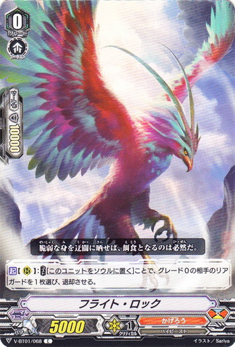 ![]() ![]() | V-BT01/068 フライト・ロック ノーマルユニット Vブースターパック 第1弾 結成!チームQ4 C 国家:ドラゴンエンパイア クラン:かげろう 種族:ハイビースト スキル:ブースト グレード:0 パワー:5000 クリティカル:1 シールド値:10000 【起】【R】:【コスト[このユニットをソウルに置く]】ことで、グレード0の相手のリアガードを1枚選び、退却させる。 脆弱な身を迂闊に晒せば、餌食となるのは必然だ。 イラスト:Sariya |