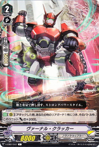 ![]() ![]() | V-EB07/047 ヴァーナル・クラッカー ノーマルユニット Vエクストラブースター 第7弾 The Heroic Evolution C 国家:スターゲート クラン:ノヴァグラップラー 種族:バトロイド スキル:インターセプト グレード:2 パワー:8000 クリティカル:1 シールド値:5000 【自】【R】:アタックした時、あなたの他のリアガード1枚につき、そのバトル中、このユニットパワーの+3000。 数と重量で押し潰す、ストロングパワースタイル。 イラスト:ダイエクスト(DAI-XT.) |