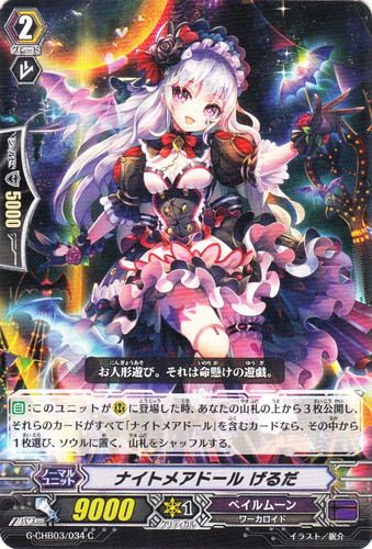 ![]() ![]() | G-CHB03/034 ナイトメアドール げるだ ノーマルユニット Gキャラクターブースター 03 月夜のラミーラビリンス C 国家:ダークゾーン クラン:ペイルムーン 種族:ワーカロイド スキル:インターセプト グレード:2 パワー:9000 クリティカル:1 シールド値:5000 【自】:このユニットが(R)に登場した時、あなたの山札の上から3枚公開し、それらのカードがすべて「ナイトメアドール」を含むカードなら、その中から1枚選び、ソウルに置く。山札をシャッフルする。 お人形遊び。それは命懸けの遊戯。 イラスト:眠介 |