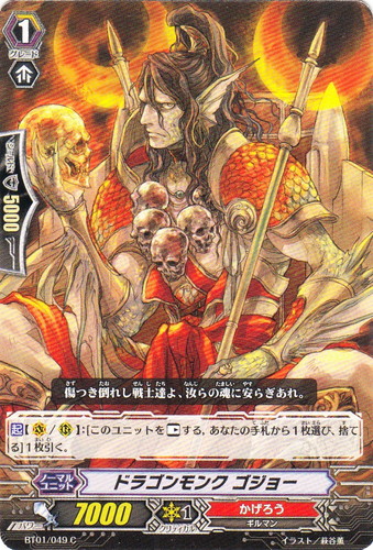 ![]() ![]() | MBD3/009 ドラゴンモンク ゴジョー ノーマルユニット This is THE 櫂トシキBOOK 付属 グロウスヴァイルデッキ 国家:ドラゴンエンパイア クラン:かげろう 種族:ギルマン スキル:ブースト グレード:1 パワー:7000 クリティカル:1 シールド値:5000 【起】【V/R】:[このユニットを「レスト」する、あなたの手札から1枚選び、捨てる]1枚引く。 強さを求め、煉獄の道を選ぶか。それもよかろう。 イラスト:萩谷薫 |