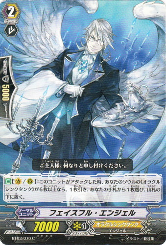 ![]() ![]() | BT03/070 フェイスフル・エンジェル ノーマルユニット ブースターパック 第3弾 魔侯襲来 C 国家:ユナイテッドサンクチュアリ クラン:オラクルシンクタンク 種族:エンジェル スキル:インターセプト グレード:2 パワー:7000 クリティカル:1 シールド値:5000 【自】【V/R】:このユニットがアタックした時、あなたのソウルの《オラクルシンクタンク》が6枚以上なら、1枚匹、あなたの手札から1枚選び、山札の下に置く。 ご主人様、何なりと申し付けください。 イラスト:萩谷薫 |