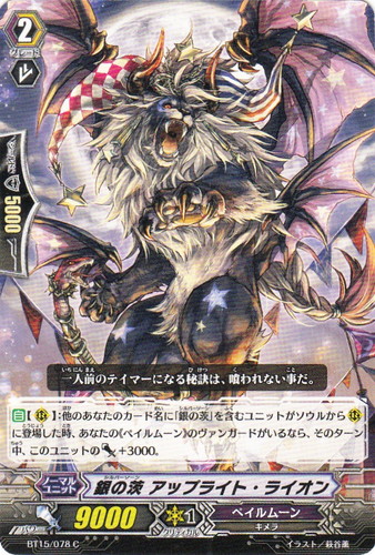 ![]() ![]() | BT15/078 銀の茨 アップライト・ライオン ノーマルユニット ブースターパック 第15弾 無限転生 C 国家:ダークゾーン クラン:ペイルムーン 種族:キメラ スキル:インターセプト グレード:2 パワー:9000 クリティカル:1 シールド値:5000 【自】【R】:他のあなたのカード名に「銀の茨」を含むユニットがソウルから【R】に登場した時、あなたの《ペイルムーン》のヴァンガードがいるなら、そのターン中、このユニットのパワー+3000。 一人前のテイマーになる秘訣は、喰われない事だ。 イラスト:萩谷薫 |