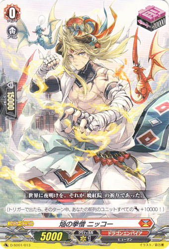 ![]() ![]() | D-SD01/013 焔の拳僧 ニッコー トリガーユニット overDress スタートデッキ 第1弾 近導ユウユ -天輪聖竜- 国家:ドラゴンエンパイア 種族:ヒューマン スキル:ブースト グレード:0 パワー:5000 クリティカル:1 シールド値:15000 トリガー:前 トリガー修正:+10000 (トリガーで出たら、そのターン中、あなたの前列のユニットすべてのパワー+10000!) 世界に夜明けを。それが「暁紅院」の祈りであった。 イラスト:萩谷薫 |