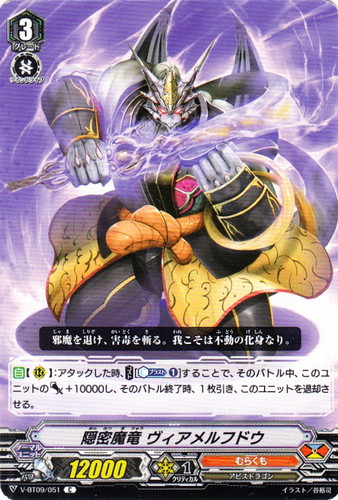 ![]() ![]() | V-BT09/051 隠密魔竜 ヴィアルメルフドウ ノーマルユニット Vブースターパック 第9弾 蝶魔月影 C 国家:ドラゴンエンパイア クラン:むらくも 種族:アビスドラゴン スキル:ツインドライブ!! グレード:3 パワー:12000 クリティカル:1 【自】【R】:アタックした時、【コスト[【カウンターブラスト①】]】することで、そのバトル中、このユニットのパワー+10000し、そのバトル終了時、1枚引き、このユニットを退却させる。 邪魔を退け、害毒を斬る。我こそは不動の化身なり。 イラスト:谷裕司 |