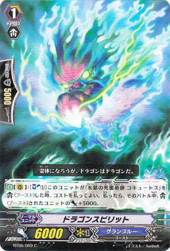 ![]() ![]() | BT06/069 ドラゴンスピリット ノーマルユニット ブースターパック 第6弾 極限突破 C 国家:メガラニカ クラン:グランブルー 種族:ゴースト スキル:ブースト グレード:1 パワー:6000 クリティカル:1 シールド値:5000 【自】【R】:[【ソウルブラスト①】]このユニットが「氷獄の死霊術師 コキュートス」を「ブースト」した時、コストを払ってよ。払ったら、そのバトル中、「ブースト」されたユニットのパワー+5000。 霊体になろうが、ドラゴンは、ドラゴンだ。 イラスト:funbolt |