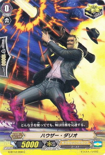 ![]() ![]() | G-BT12/058 ハウザー・ダリオ トリガーユニット Gブースターパック 第12弾 竜皇覚醒 C 国家:ユナイテッドサンクチュアリ クラン:オラクルシンクタンク 種族:ゴースト スキル:ブースト グレード:0 パワー:5000 クリティカル:1 シールド値:10000 トリガー:☆ トリガー修正:+5000 どんな手を使ってでも、奴は任務を完遂する。 イラスト:いけだ |